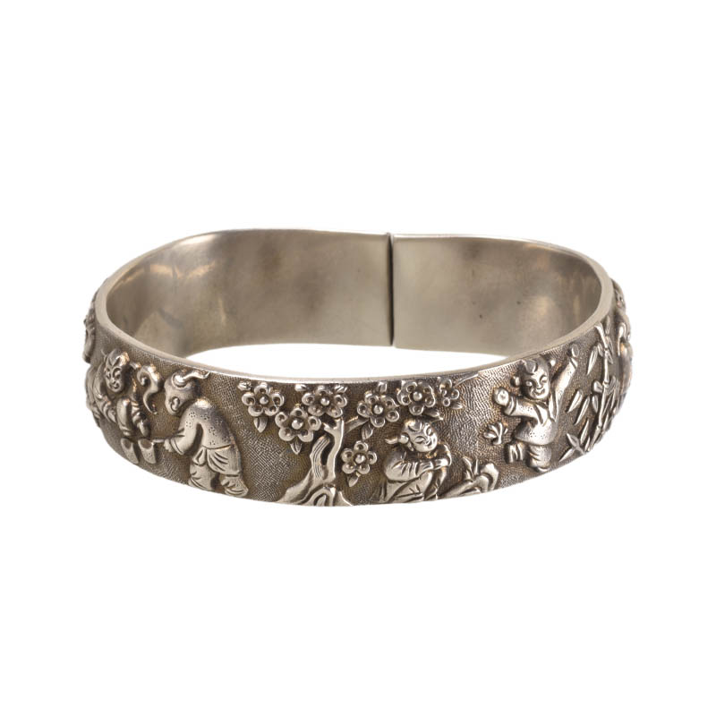 A Vintage High-Relief Bracelet Featuring A Playful Image Of Children, Auspicious And Auspicious, High-Relief Ethnic Silver Jewelry