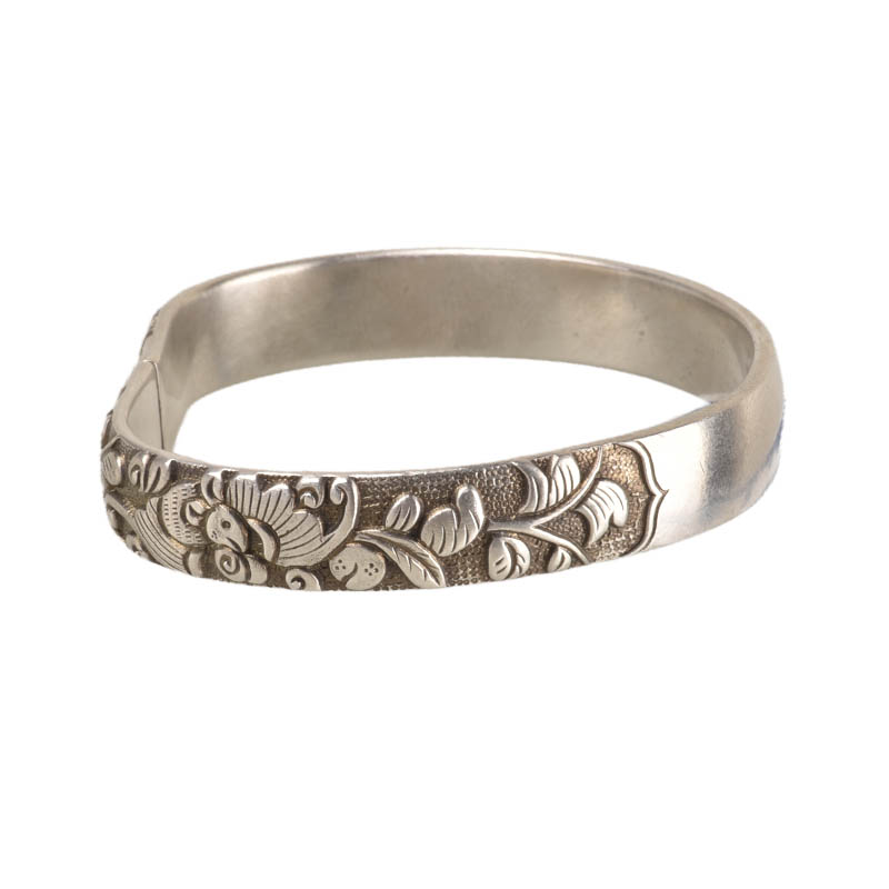 Made of 999 pure silver, the entwined floral motif is a classic motif in traditional Chinese decorative art. Using winding branches as a framework, it connects the diverse floral forms, creating a visual effect of continuity and endless life. Combining the beauty of nature with humanistic philosophy, it showcases the vitality and prosperity of life while imbuing it with profound meanings of good fortune, prosperity, and longevity. Its open design allows for easy wear and fine adjustments to wrist size. While retaining the characteristics of traditional silver bracelets, it also incorporates modern practicality, achieving a balance between tradition and practicality. The bracelet measures 58 cm in diameter, 1 cm in width, and weighs approximately 45 grams.