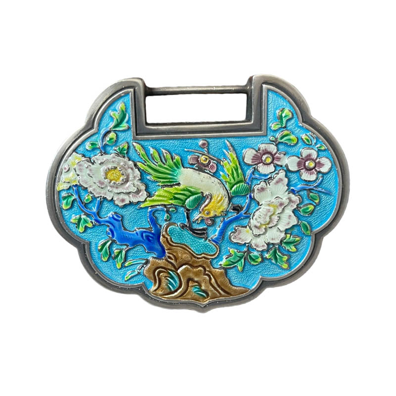 Retro "Phoenix Through Peony" enamel silver lock, approx. 80.7g, 85mm long, 65mm wide