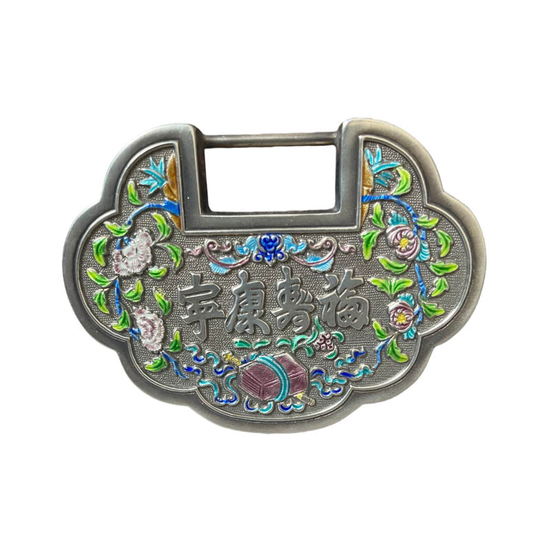 Retro "Fortune, Longevity, Health" enamel silver lock, approx. 73.6g, 86mm long, 61mm wide