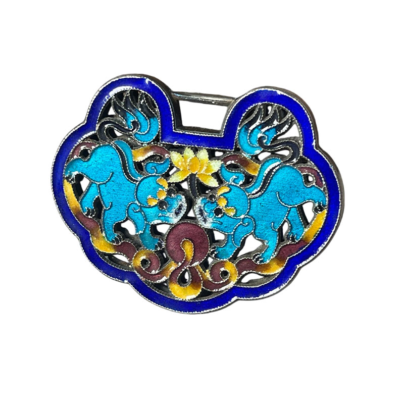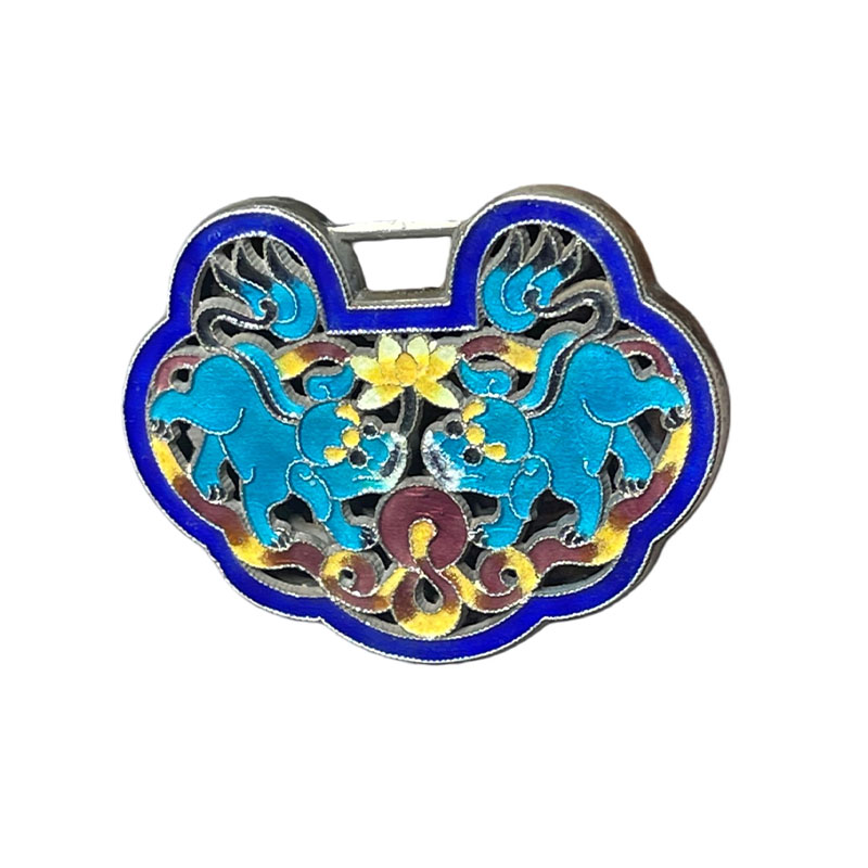 "Lions Playing with Embroidered Ball" Cloisonné Hollow Silver Lock